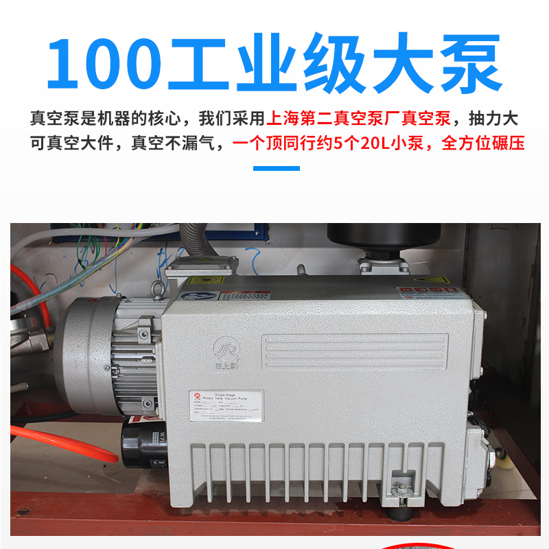 该机采用国内知名品牌上海第二真空泵产生产的工业级大泵,引起德国普旭技术,部分核心部件为全进口,关键部位材质含有微量金属元素,真空泵寿命更持久,其中真空油为专业配方,耐高温,比传统真空泵油更耐用。抽气速率为100m³/H,